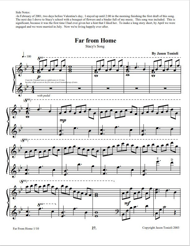 Download the PDF version of piano sheet music for Far From Home (Stacy’s Song) by pianist Jason Tonioli. This beautiful piano piece is perfect for piano recitals, solos, church meetings, and anytime you want soothing, peaceful piano music in your life. Download the piano sheet music today.