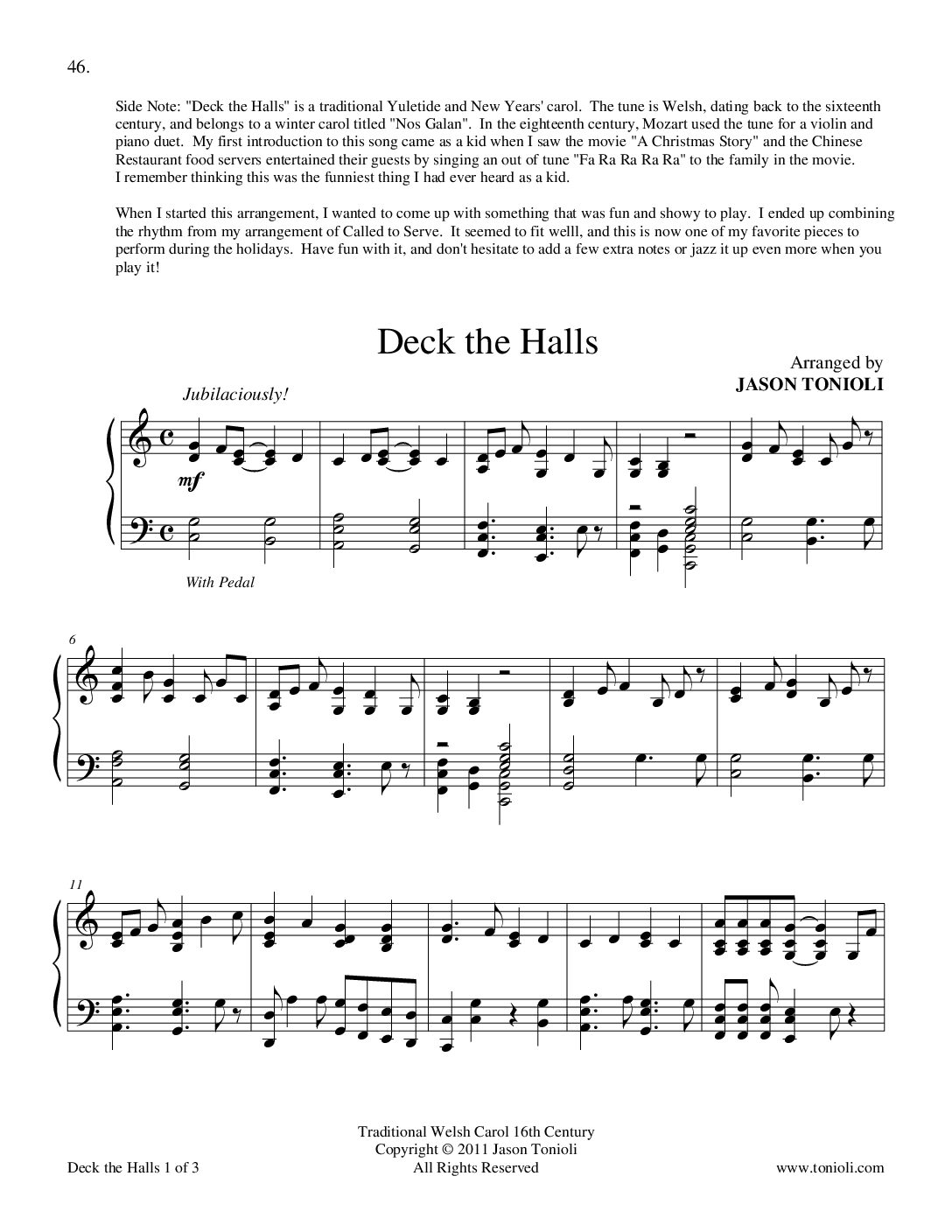 Download piano sheet music for the favorite Christmas carol Deck The Halls, arranged by Jason Tonioli. This piano arrangement puts a new spin on a beloved carol that will be a great addition to your holiday music repertoire. This piano arrangement of Deck The Halls is perfect for playing in solos, recitals, church meetings, and any holiday setting. Download the sheet music today.