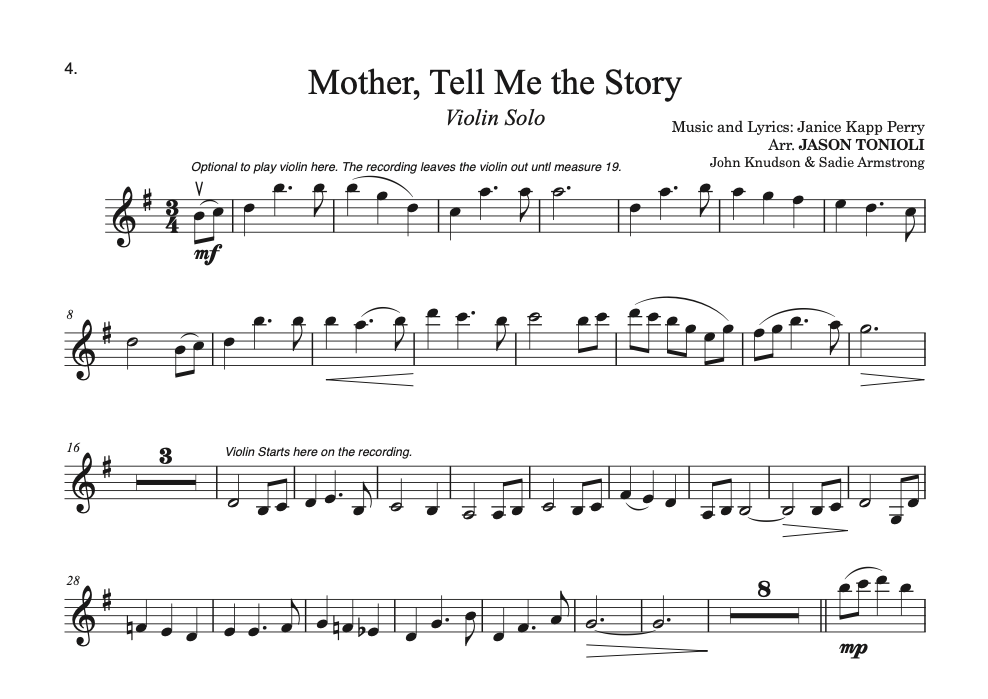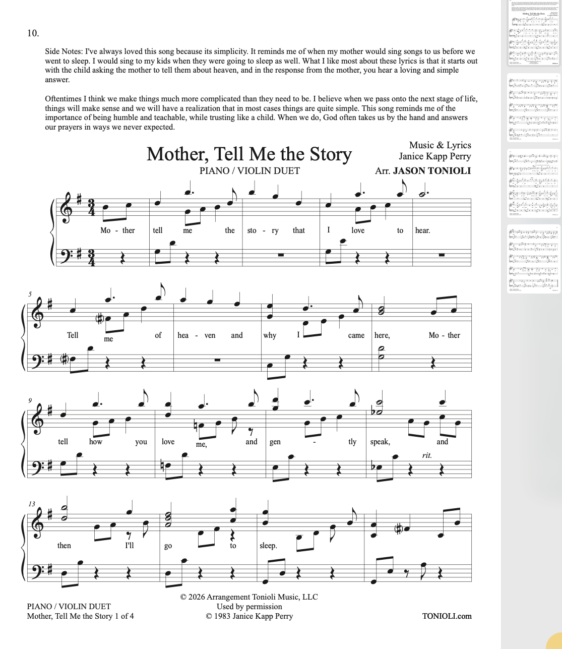 DUET – Mother Tell Me the Story (Violin & Piano Duet) – Janice Kapp Perry – SINGLE SONG DIGITAL PDF SHEET MUSIC$9.95