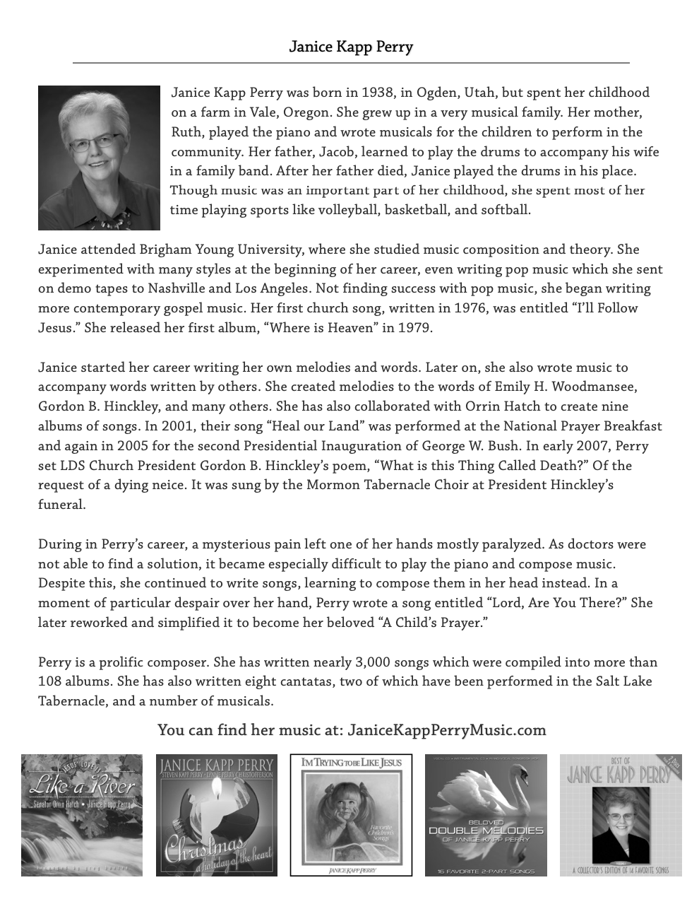 Our hope is that these new duets that we’ve created will honor the legacy of these tunes and the life’s work of Janice Kapp Perry. We also hope that the new take on this classic songs will become some of your favorites and that the music will be able to be played and heard by generations to come, preserving these melodies and the messages that they share.