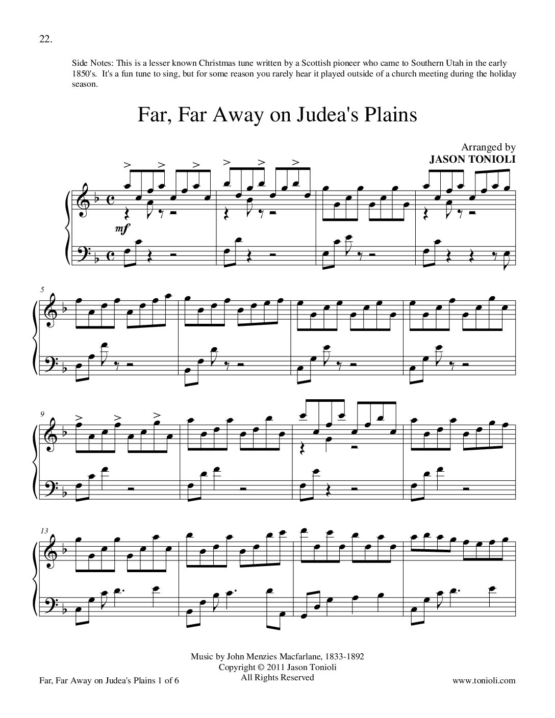 Download PDF sheet music for the popular Christmas hymn Far, Far Away on Judea’s Plains. This holiday favorite has been arranged for piano by Jason Tonioli. This piano music is perfect for holiday gatherings, church meetings, recitals, and more. Intermediate level and above players will find this perfect for their skill level.
