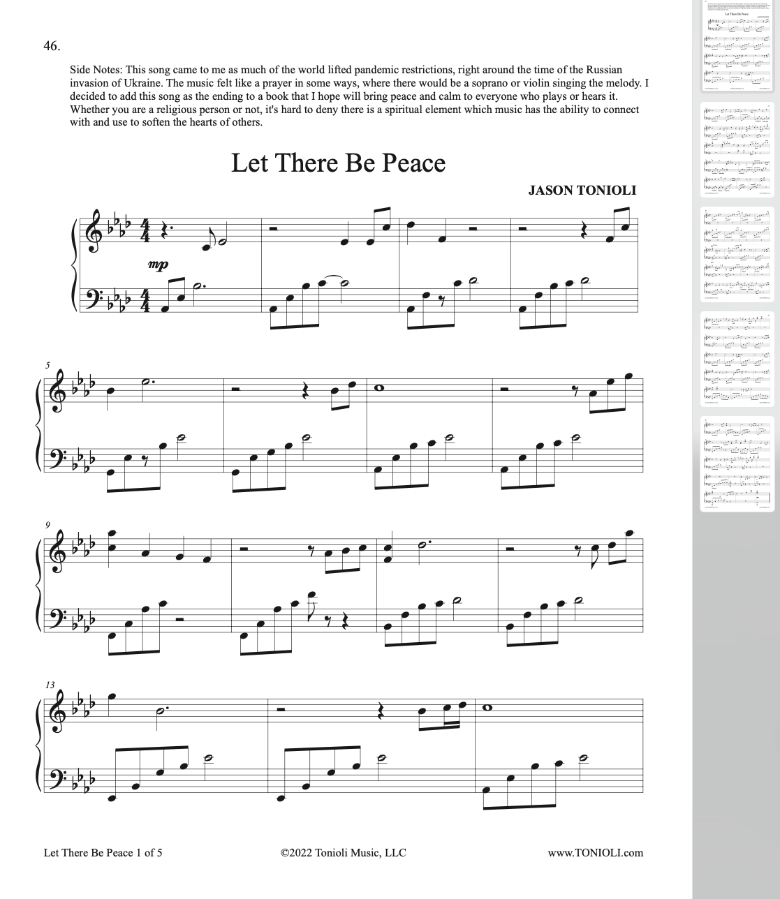This is a digital PDF Sheet music for the song “Let There Be Peace ” from the piano solo book “Songs for Peace”.