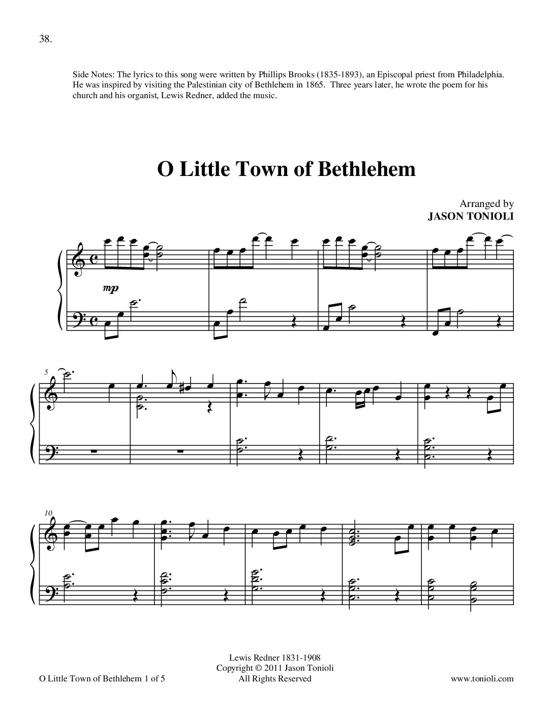 This piano sheet music for O Little Town of Bethlehem has been given a new interpretation in this arrangement by Jason Tonioli. This version of the favorite Christmas hymn is perfect for recitals, concerts, holiday parties, and more. Download the PDF sheet music today.