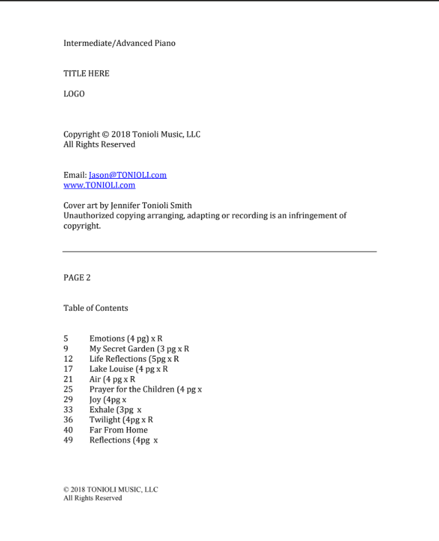 Piano Reflections is a brand new, as of December 2018, piano music book, just in time for Christmas! This is new age pianist Jason Tonioli’s newest book of original new age piano solos. There are over 11 piano solos in this book. All songs are intermediate to advanced level of difficulty.