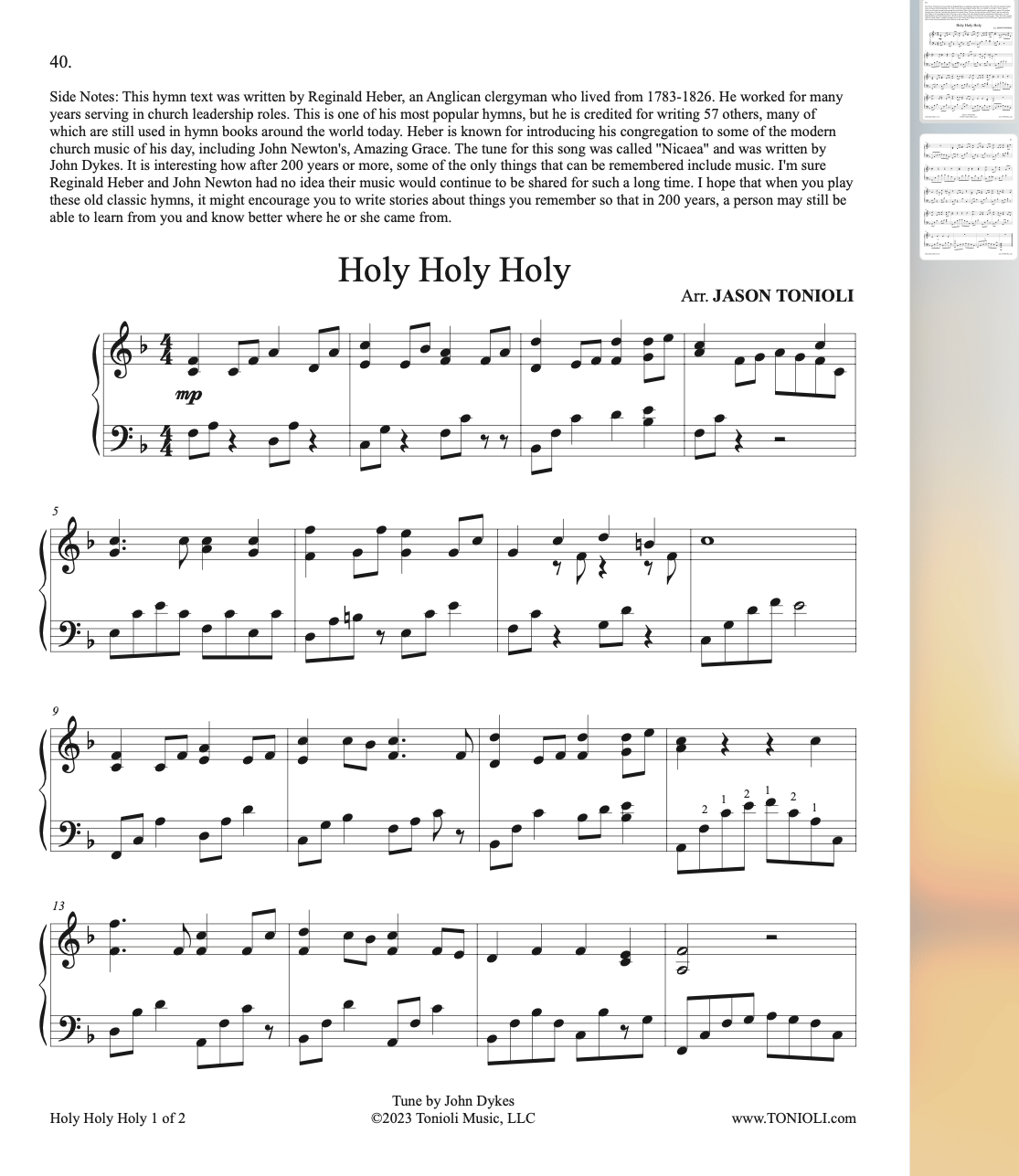 This book contains 10 piano hymn arrangements from acclaimed composer and arranger Jason Tonioli. You’ll find the sheet music in this book perfect for piano recitals, worship services, sacrament services and other church settings. Songs in this book are written for intermediate pianists though will also satisfy accomplished players and are meant to sound much harder than they are to play.