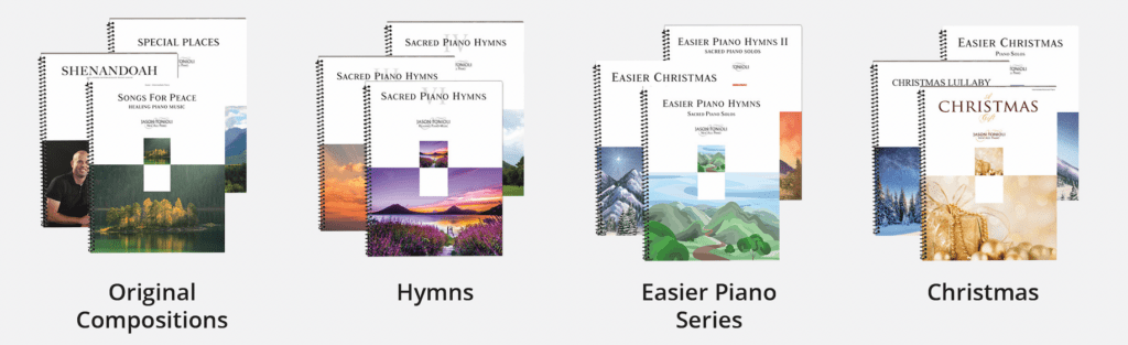 Most of Jason’s Piano music has been at an intermediate or advanced level until now. If you would like to check out the newest “Easier” series, follow the links below. These are not big note “super” easy books but they are meant for those who are at a level where they can nearly play a song from a hymn book. This new series was created with feedback and input from over 800 piano teachers and piano music players. We hope it is something that will be enjoyed for years to come. The songs sound so much harder than they actually are to play!